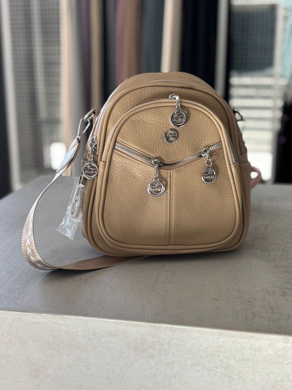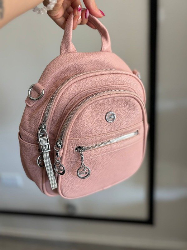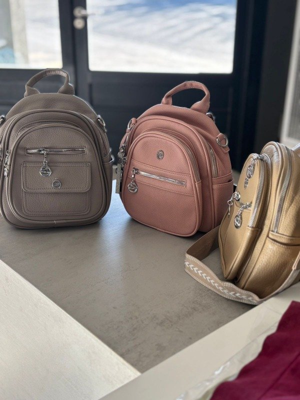 Mochilita de eco cuero linea IRUN. Chiquita con varios cierres, ideal para llevar al gym. También viene con correa para usar como bandolera