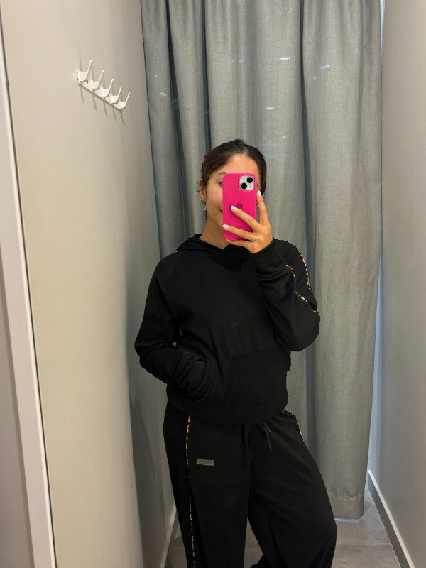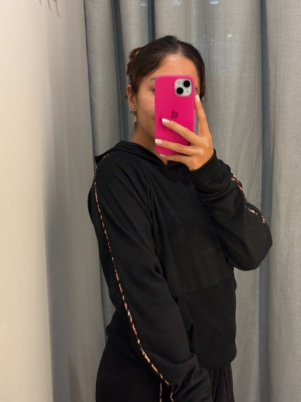 Buzo de tela darlon, línea cien por ciento. Es negro con tiras de animal print en las mangas, bolsillos canguro.