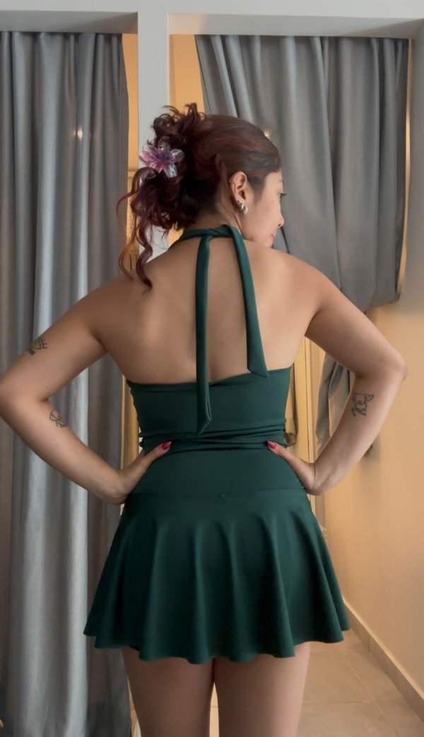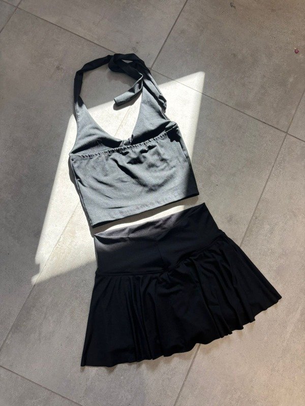 Conjunto pollera con calza + top con espalda descubierta y lazos para atar en el cuello. La pollera tiene cintura en V, cortita.