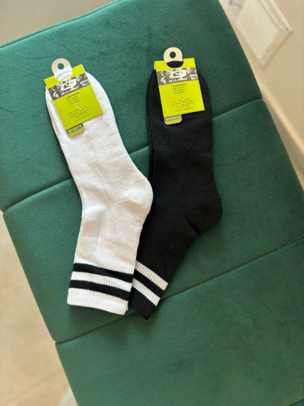 Medias por unidad estilo tenis, 3/4. Blancas con rayas negras y visceversa. Son de 80% algodón.