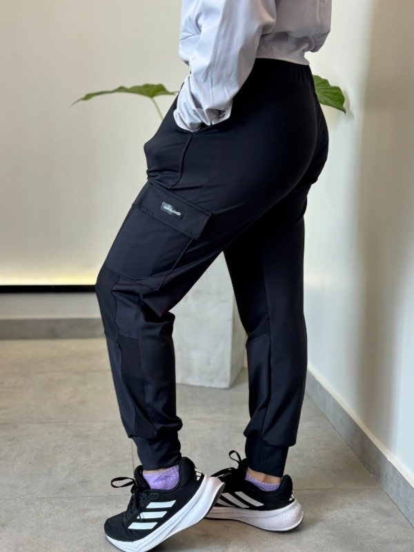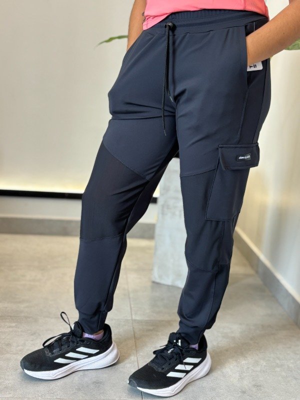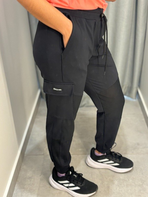 Babucha de línea CXC. Es de tela two face, gruesita que no trasparenta ni trasluce nada. Tiene detalles de tul en las zonas de las rodillas y bolsillo lateral. Cordón regulable en cintura, bosillos y puños.